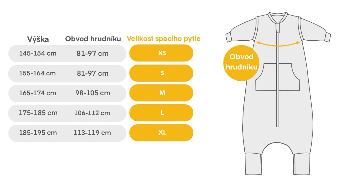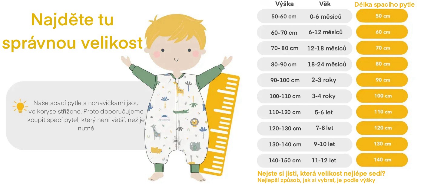 Správně zvolená velikost spacího pytle s nohavičkami je důležitá pro pohodlný, bezpečný a klidný spánek. Díky našim tabulkám velikostí snadno zjistíte, který model bude sedět nejlépe – ať už vybíráte pro miminko, větší dítě, teenagera nebo pro sebe.