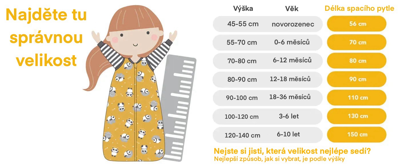 Správně zvolená velikost spacího pytle je důležitá pro bezpečný, pohodlný a klidný spánek. Díky naší tabulce velikostí snadno zjistíte, který klasický spací pytel bude pro Vaše dítě ten pravý.