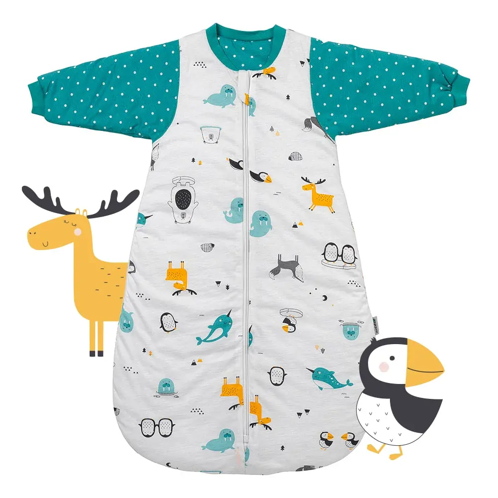 Měkký a příjemný, zimní dětský spací pytel s RUKÁVY, byl vyrobený v délce 90cm a je vhodný pro dítka ve věku 6-18měsíců. Podle toho, jak je děťátko do pytlíčku oblečené, je použití spacího pytlíčku ideální v teplotách do 18°C. Na výrobu tohoto dětského spacího pytle byla použita výhradně 100% BIO bavlna a prodyšné rychleschnoucí polyesterové rouno.